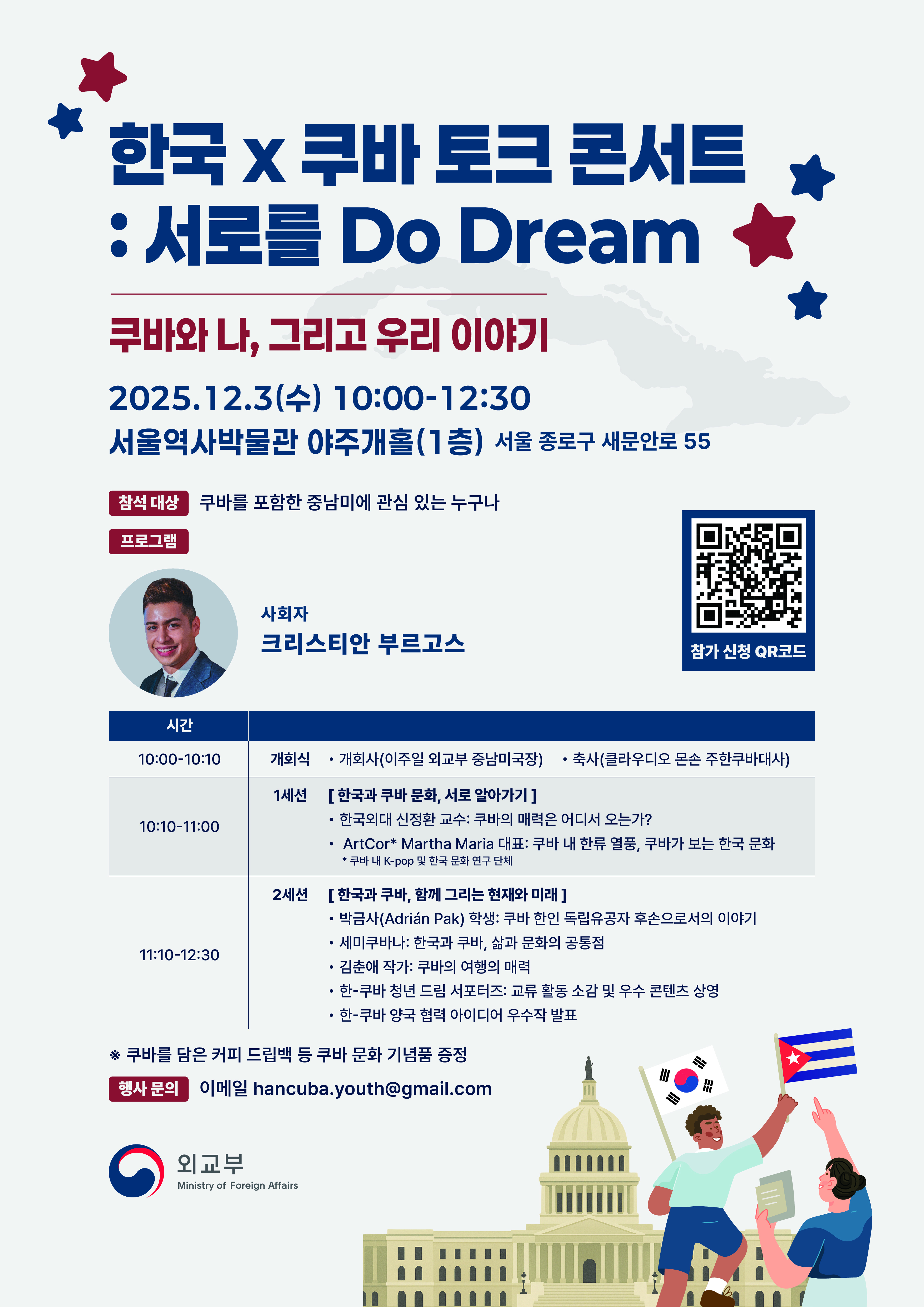 ▪️행사 개요 - 행사명: 한국 x 쿠바 토크 콘서트: 서로를 Do Dream- 일시: 2025년 12월 3일(수) 10:00~12:30- 장소: 서울역사박물관 야주개홀 1층 - 주최: 외교부- 언어: 한국어 및 스페인어 (동시통역 제공)